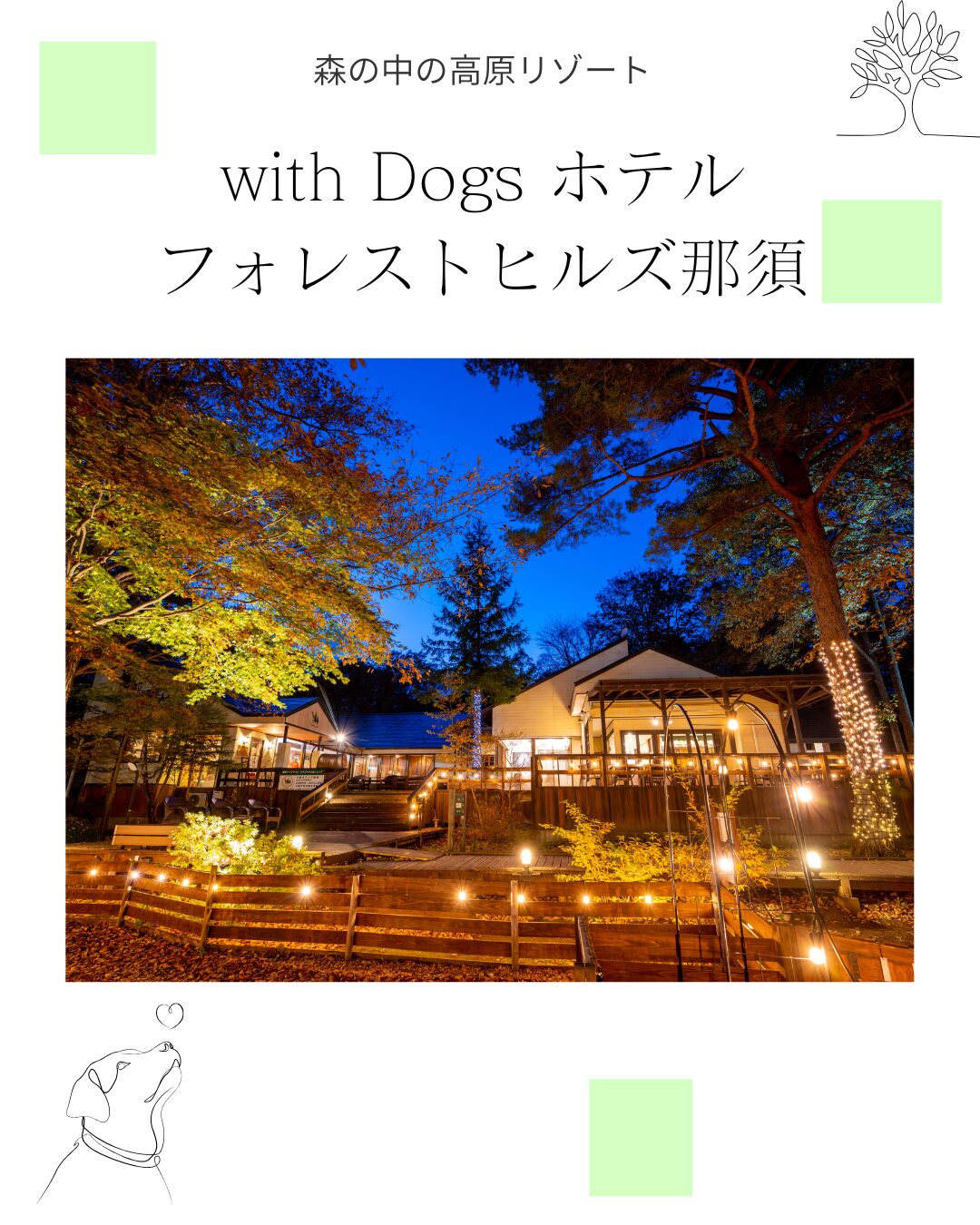 愛犬と一緒に泊まれる、自然に囲まれたコテージタイプのリゾートホテル。 ドッグランや愛犬と楽しめる施設が併設され、滞在中も愛犬がのびのび。 愛犬とと一緒に食事ができるプランや、愛犬と一緒にお風呂に入れる露天風呂付き客室も魅力です。