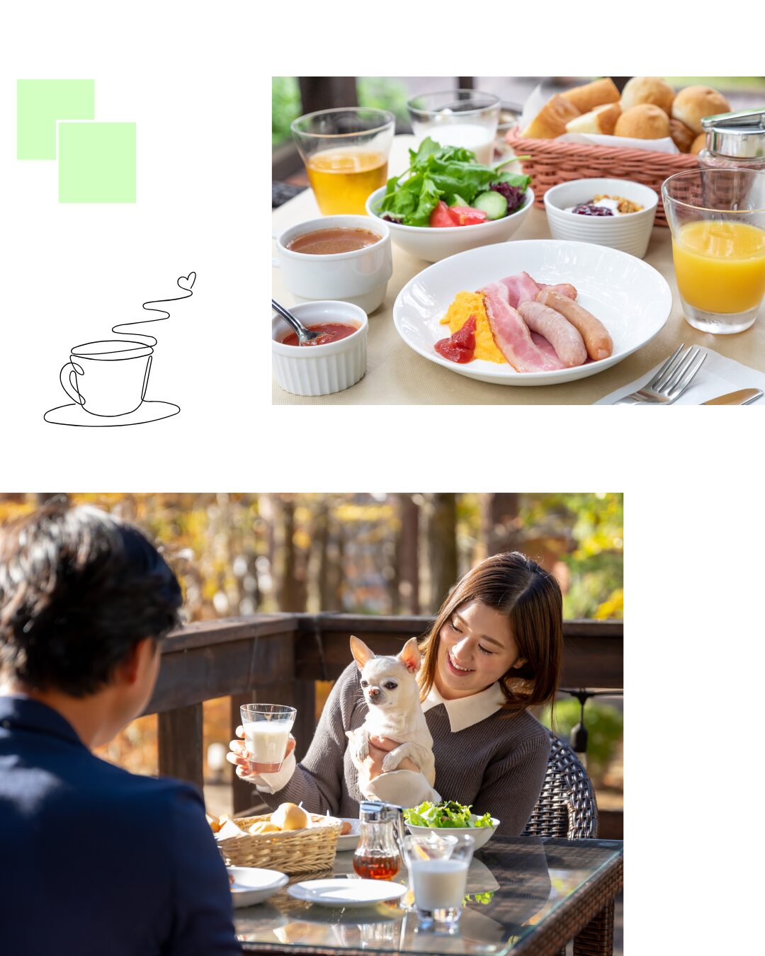 朝の散歩を楽しんだあとは、愛犬と一緒に朝食の時間。 天気の良い日はペット可のテラス席で、春の新緑と澄んだ空気を感じながらゆったり過ごせます。 朝食はビュッフェスタイルで、愛犬連れでも自分のペースで楽しめるのが魅力です。