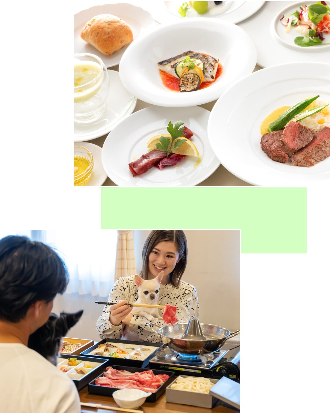 夕食は愛犬と一緒に楽しめるペット可レストランやお部屋食で、那須の食材を味わえます。